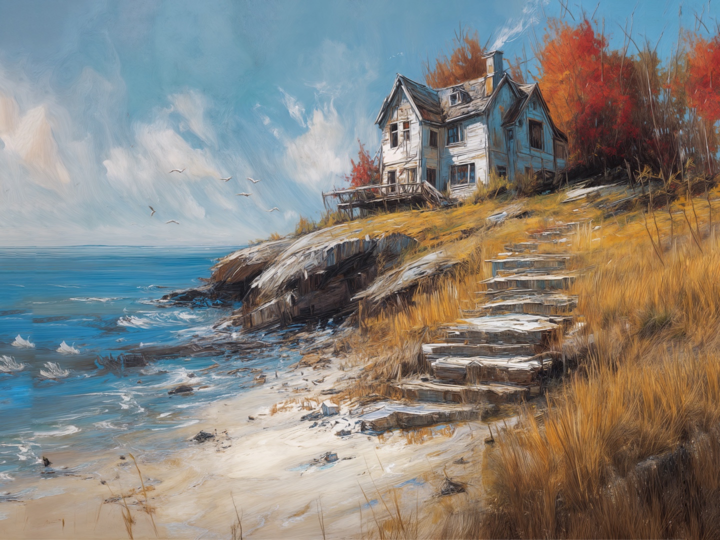 A weathered white cottage crowns a grassy, windswept bluff above a restless blue sea. Rough wooden steps climb from a sandy, rock-strewn beach up through golden autumn grasses toward the house, framed by fiery red and orange trees. Soft clouds drift across a bright sky as seabirds wheel over the waves. Strong leading lines, rich textures, and warm–cool contrasts make this coastal scene ideal for studies of atmosphere, storytelling, and expressive brushwork in any painting style.