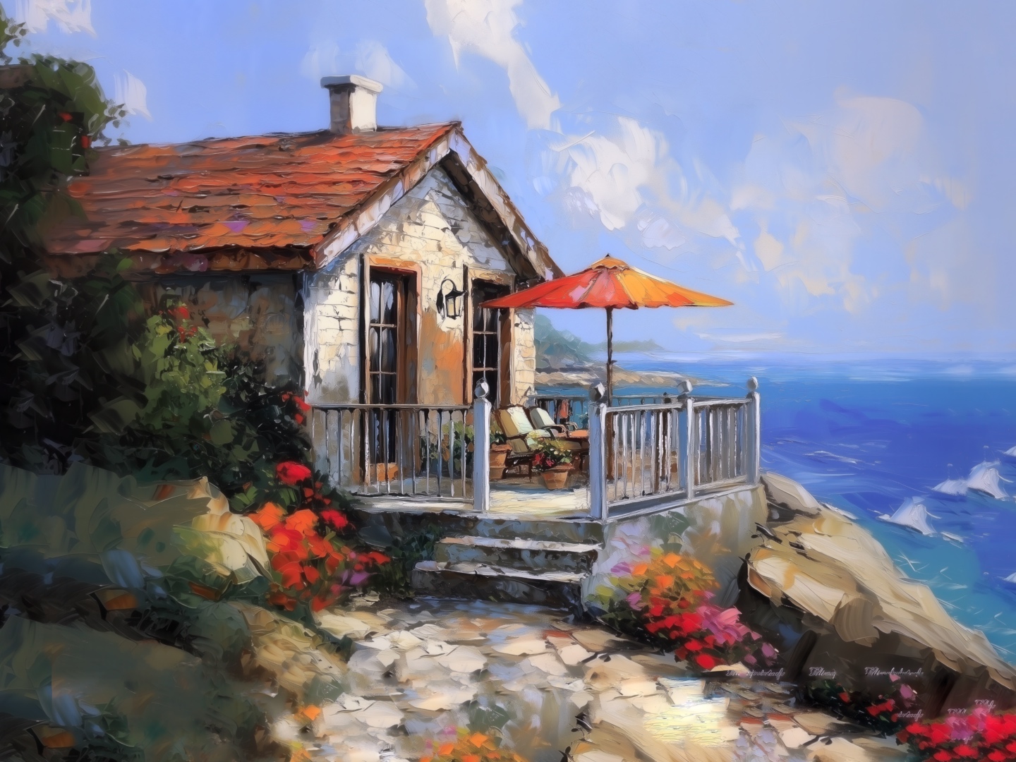 Step onto this sunlit terrace and imagine the sound of waves below as you bring this coastal cottage to life on your canvas. This reference is full of painterly possibilities: warm stone walls, brilliant flowers, dappled path, and shimmering blue water stretching to the horizon. Explore color harmony between the terracotta roof and cool sea, or push the drama of light and shadow across the porch and steps. Whether you paint loosely or with fine detail, this scene invites you to create your own peaceful seaside retreat.