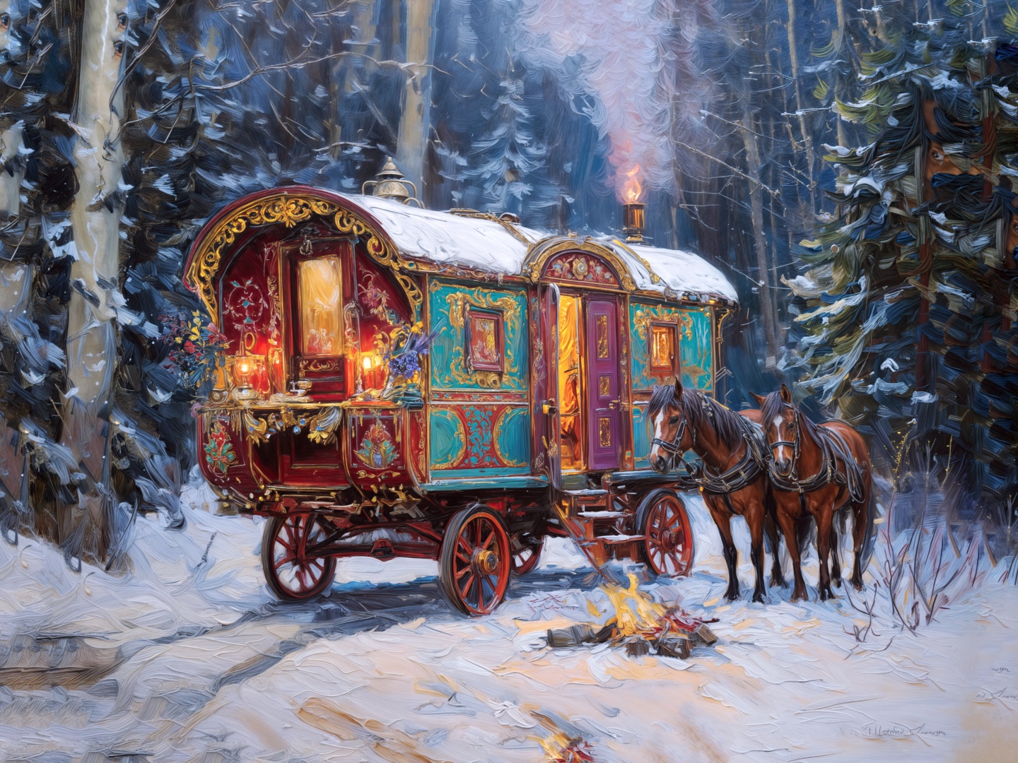 A richly decorated gypsy wagon glows in a snowy forest clearing, its red and turquoise panels trimmed with ornate gold designs. Warm light pours from its windows and door, contrasting with the cool blues of the snow and trees. Two brown horses stand harnessed at the front, illuminated by a small campfire in the foreground. Tall snow-dusted trunks and evergreens surround the scene, creating a quiet, storybook winter atmosphere ideal for exploring light, texture, and narrative in paint.