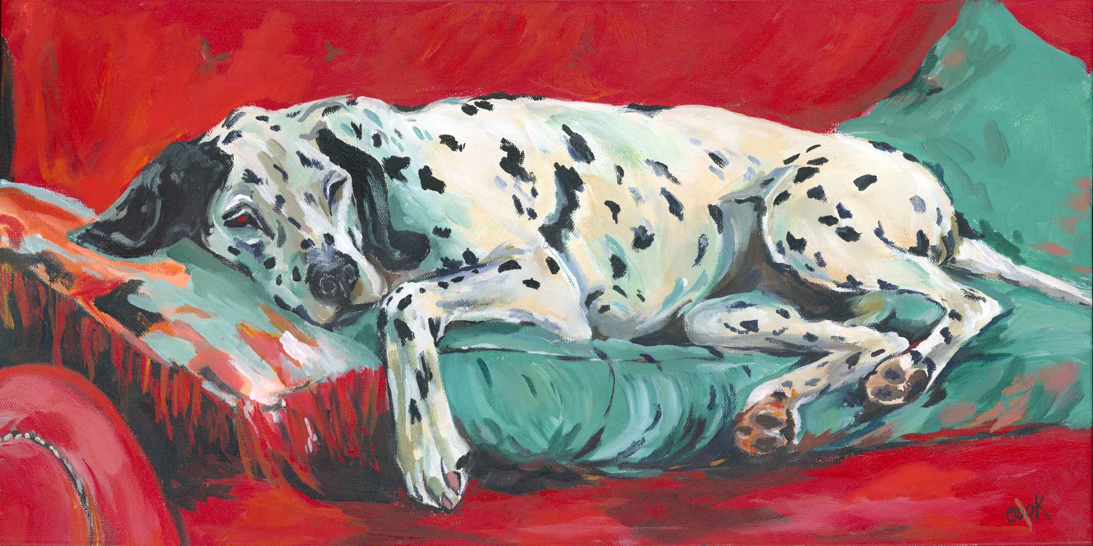 Experience pure relaxation as a graceful Dalmatian dozes on a vibrant, stylish sofa. The bold colors and gentle mood will inspire your creativity and make you eager to capture this peaceful moment on canvas. Perfect for artists who love expressive color and cozy scenes.